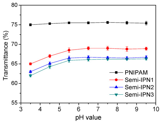 Transmittance of the PNIPAM and semi-IPN microsphere suspensions in different pH conditions at 25 °C.