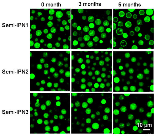 Unlike covalently cross-linked structures, physical entanglement is usually not permanent [49]. In the semi-IPNs system, the PAAc chains and PNIPAM network interacted with each other by hydrogen bond and physical entanglement; thus, it was possible for a fraction of the PAAc chains to diffuse out of semi-IPN microspheres during the storage period. In the enzyme immobilization process, the medium is always a pH 7.0 PBS solution, and the microspheres are usually kept in this solution. The change of functional groups in the microspheres greatly influenced the morphology and the dispersibility of the microspheres, and thus would change the configuration of the enzyme molecules. Taking this into account, an investigation of the morphology and particle size was used to study the stability and dispersibility of microspheres. As shown in Figure 11, all the semi-IPN microspheres were labeled well as Rhodamine 123 (Rh123) has amino groups that would interact with the carboxyl groups of the microspheres. After three months, no obvious change in the fluorescence distribution of the samples was observed. Because only PAAc chains were labeled by Rh123 in the microspheres, the leaching phenomenon of PAAc was hardly observed, which implied that the PAAc chains stably existed in the semi-IPN microspheres over the three months. With a storage time of up to six months, all the samples still had good dispersibility. The morphologies of the semi-IPN2 and semi-IPN3 microspheres were almost the same as the original, whereas there was a little change in the fluorescence distribution in the semi-IPN1. The fluorescence tended to distribute near the surface of the semi-IPN1 microspheres, suggesting that the PAAc chains in the semi-IPN1 could diffuse out of the microspheres easier than the other samples. Combined with the TEM images, the reason for this might be a loose structure in the semi-IPN1.