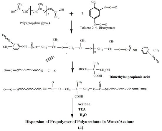 WPU aqueous dispersions with different solid contents were prepared as described in our previous work [,]. At first a four-neck glass flask of volume 500-mL was equipped with a heating mantel and a nitrogen supply line. About 1.58 g of DMPA and about 23.60 g of PPG were added to the flask and heated to a temperature of 80 °C. The mixture was continuously agitated for 1 h using a magnetic stirrer. About 7.2 g of TDI was added slowly drop-by-drop, and the reaction was left to proceed for 3 h under dry nitrogen atmosphere. The temperature was cooled down to 40 °C, the viscosity was reduced by adding acetone in the reactor. The—COOH groups of DMPA were neutralized by adding TEA, and the mixture was vigorously stirred for 1 h in order to disperse it in distilled water. To finish, the stirring at ambient/room temperature was continued overnight and various groups of WPU dispersions with different solid contents were prepared by adding desired amount of distilled water, and coded as WPU13, WPU15, WPU17, WPU20, WPU22, and WPU25, corresponding to solid contents of 13, 15, 17, 20, 22, and 25 wt %, respectively.