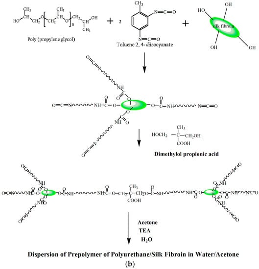 Schematic representation of the preparation of: (a) WPU Prepolymer and (b) the WPU-SF dispersions in Water/Acetone.