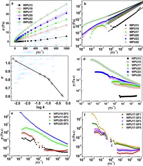Steady-shear flow behavior of WPU dispersions: dependence of the shear stress σ on the shear rate γ (a,b); flow behavior index, n, as a function of log k (c); and dependence of the steady shear viscosity on the shear rate for WPU dispersions with different solid contents (d); for WPU-SF3 dispersions (e); and for WPU17-SF (f) at T = 25 °C, respectively.