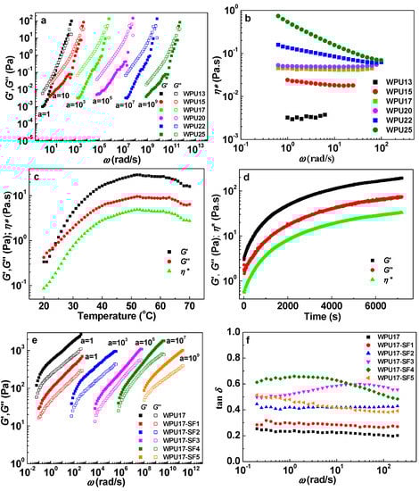 Dynamic rheological behavior of WPU and WPU-SF dispersions under oscillatory shear: (a,b) G′ and G′′, and η* as a function of ω for WPU dispersions with different solid contents at T = 25 °C; (c,d) Temperature and time dependence of G′, G′′, and η* for the WPU17-SF5 dispersion; (e,f) Dynamic shear moduli, G′, and G′′, and loss tangent, tan δ as a function of ω for WPU17-SF dispersions with different silk fibroin contents at T = 37 °C. The x-axis of (a,e) is extended by a factors a = 1~109 to obtain a valid comparison.
