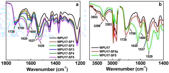 FTIR spectra of the WPU17, WPU17-SF and WPU17-SF5a films: (a) FTIR spectra of the WPU17 and WPU17-SF films in the wavenumber range of 1800–1200 cm−1; and (b) FTIR spectra of the WPU17, WPU17-SF5a, and WPU17-SF5 films in the wavenumber range of 3750–1400 cm−1.