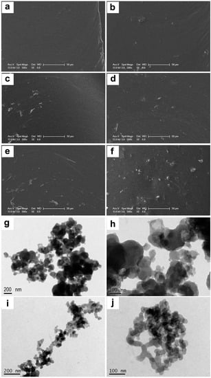 SEM and TEM images of the cross-sections of WPU and WPU-SF films: (a–f) SEM images of the WPU17, WPU17-SF1, WPU17-SF2, WPU17-SF3, WPU17-SF4, and WPU17-SF5 films in sequence; (g–j) TEM images of the WPU17-SF3 film.