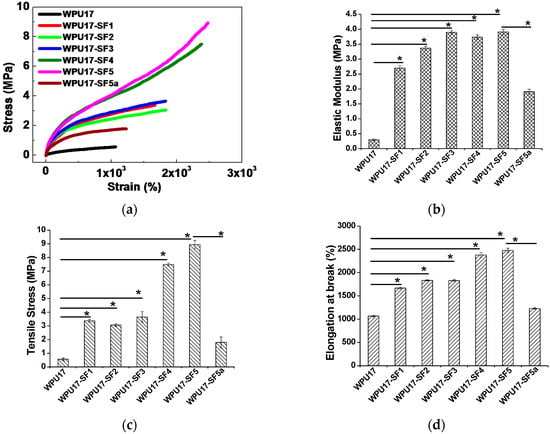 Uniaxial tensile mechanical properties of WPU17 and WPU17-SF films: (a) stress-strain curves; (b) elastic modulus; (c) tensile strength; and (d) elongation at break. WPU17-SF5a is the blended film with 5 wt % SF, which is prepared by blending SF into WPU17 dispersion, and is plotted for comparison. The bars represent mean ± standard deviation (n = 3; *p < 0.05).