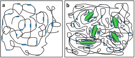 Schematic Illustration of Phase Separation in the: (a) WPU17 and (b) WPU17-SF films. The black and thin line, the blue and thick line, and the green ellipsoid represent soft segments of polyurethane, hard segments of polyurethane, and silk fibroin, respectively.