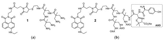 As can be inferred from their RSASA, which can represent the effective macromolecule size, the introduction of the fluorophore with the link to dendron 1, results in a size similar to the corresponding G2-amino-dendrimer [4]. For compound 2, introduction of the amoxicilloyl moiety increased it to a size similar to that of the G3-amino-dendrimer.