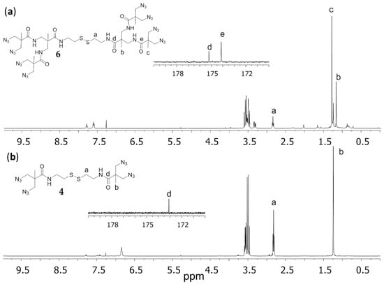 Figure 2. NMR comparison between: (a) generation 2 azide derivative 6 and (b) generation 1 azide derivative 4 (400 MHz 1H NMR, 101 MHz 13C NMR in CDCl3).