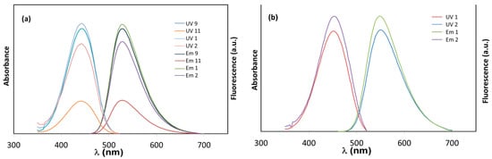 Figure 5. Absorption and fluorescence emission spectra of (a) 9, 11, 1, and 2 in DMSO and (b) 1 and 2 in PBS (pH = 7.4).