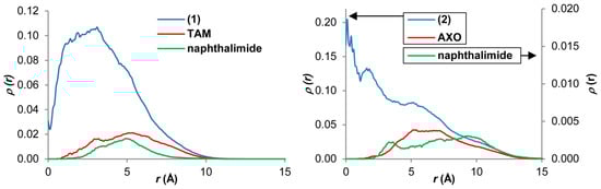 The distribution of different residues within molecules can be described by their radial density profiles (Figure 7 and Figure S40 in the Supplementary Materials). For dendrons 1 and 2, the probability of finding the terminal monomers (TAM or AXO) always tends toward the periphery of the molecules, making these residues more exposed to the solvent. The naphthalimide moiety is also positioned toward the periphery in a similar way (Figure 6).