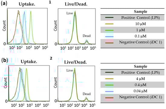 Figure 8. Flow cytometry histograms: (a) Uptake and Live/Dead ratio for 1; (b) uptake and Live/Dead ratio for 2.
