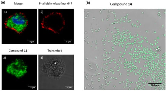 Figure 9. Confocal microscope images of DCs fixed after incubation with compounds 1 and 2 then stained with DNA- (Hoescht; blue) and actin- (Phallodin; Red) specific stains to complement naphthalimide fluorescence (green): (a) Detail of a DC incubated with 1: (1) Combination of all measured channels including; (2) Phalloidin-Alexafluor 647 cortical stain; (3) Naphthalimide fluorescence (4) Transmitted light (non-confocal); (b) DC population incubated with 2, combined naphthalimide fluorescence emission, and transmitted light channels.