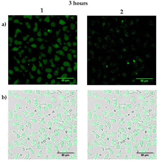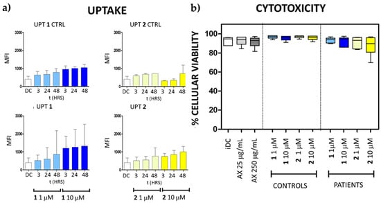 After confirming the cellular uptake by DCs of both compounds and the absence of high mortality among cell populations, the next step was to analyze the effect of incubating them with cells from allergic patients at different time-points. As before, the uptake of the compounds and their cytotoxicity was obtained by flow cytometry (Figure 10). Uptake experiments, in terms of median fluorescence intensity (MFI) at different incubation times and at the two different concentrations (1 and 10 μM) that previously showed higher internalization rates, have been carried out. iDCs without the addition of either compound were used as the fluorescence-negative control. Confocal microscope images of the different populations were also captured (Figure 11).