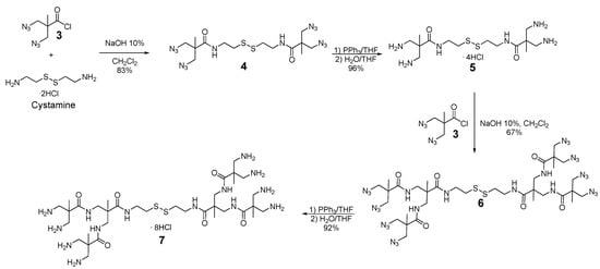 First amide formation between cystamine dihydrochloride and 3 was carried out in NaOH/CH2Cl2 under Schotten-Baumann conditions [29,30] to obtain generation 1 dendrimer After a Staudinger reduction [31,32] of the azide groups with PPh3 in THF to provide the ammonium derivative, a second sequence of coupling and reduction led to generation 2 dendrimer, 7.