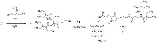 The final step consists in the reduction of the disulfide bond of dendrimer 7 using dithiothreitol (DTT) to obtain two dendrons with a thiol group in the focal point, 12. In the presence of the maleimide ring, the thiol group selectively attacks the double bond, resulting in the fluorescent dendron 1 (Scheme 3).