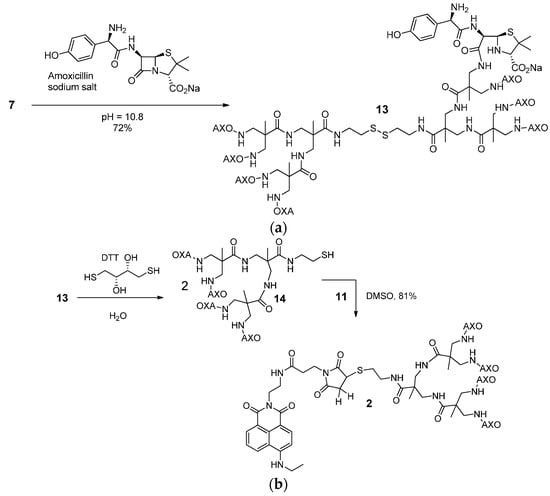 From this fluorescent dendron, functionalization of the ammonium groups was tested using amoxicillin by inducing the attack of the amino groups to the betalactamic ring. However, the reaction did not proceed. An alternative method consisting of the functionalization of dendrimer 7 was first carried out. To a solution of 7 in water at pH = 10.8, amoxicillin in its sodium form was added in portions over 48 h. The resulting dendrimeric antigen 13, was then purified by gel filtration chromatography, Sephadex G-10 in water (Scheme 4a).