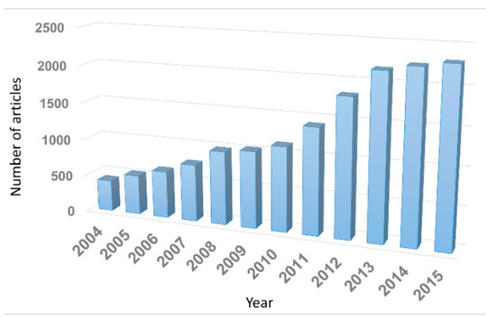 The number of articles published on CP nanomaterials over the last decade. Data from the ISI Web of Knowledge database.