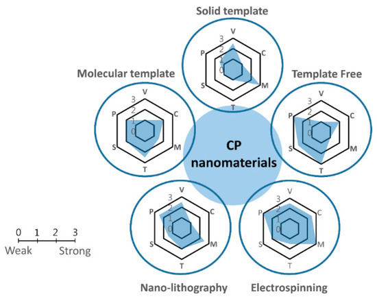 Schematic of the synthesis methods for CP nanomaterials. Each mechanism has been evaluated in term of variables (V), in which a low value means there are many key variables in the synthesis process; cost aspect (C), in which a low value corresponds to high cost; morphology control (M); time consumption (T); scalability (S); and purity (P) of the products.