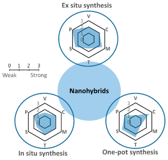 Schematic of nanohybrid synthesis methods. Each mechanism has been evaluated in terms of variables (V), in which a low value means there are many key variables in the synthesis process; cost (C), in which a low value corresponds to high cost; morphology control (M); time required (T); scalability (S); and purity (P) of products.