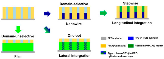 Block copolymers can also be used as templates, where CPs are generally synthesized in a microphase-separated domain. For example, Komiyama et al. [60] reported electropolymerization of pyrrole and bithiophene (BiTh) using PEO-filled cylindrical domains of a microphase-separated PEOm-b-PMA(Az)n as a template, where the PMA(Az) indicates polymethacrylate with azobenzene-mesogen in side chain. The results were very impressive: while one-pot polymerization gave lateral-composition-modulated copolymer structures, stepwise polymerization created PPy-PEDOT or PEDOT-PPy nanowire heterojunctions (Figure 6).