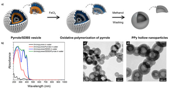Preparation of PPy hollow nanoparticles. (a) Schematic of the formation mechanism, (b) UV-vis absorption spectra of aminopyrene in different solvents; (c,d) Transmission electron microscopy (TEM) images of the hollow PPy nanoparticles with diameters of 100 and 200 nm, respectively. Reprinted with permission from [67]. Copyright 2015, Nature Publishing Group.