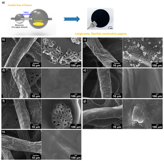(a) Vapor-phase polymerization (VPP) of pyrrole with co-vapors on a cellulose substrate and a typical photograph of as-prepared paper; (b–h) Scanning electron microscopy (SEM) images of papers prepared with co-vapors: (b) methanol, (c) ethanol; (d) water; (e) hexane; (f) toluene; (g) benzene; and (h) no vapors. (left: low magnification, right: high magnification). Reprinted with permission from [105]. Copyright 2015, Nature Publishing Group.
