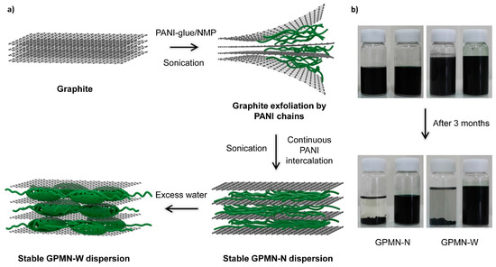 (a) Schematic illustration of the formation of graphene/PANI multilayered nanostructures (GPMNs) by direct physical exfoliation of graphite with PANI glue; (b) Photographs showing the long-term colloidal stability of the GPMN dispersion solution in the absence (left) and the presence (right) of PANI glue. GPMNs showed outstanding colloidal stability in both N-methyl-2-pyrrolidone (NMP) and water. Reprinted with permission from [45]. Copyright 2015, John Wiley & Sons.