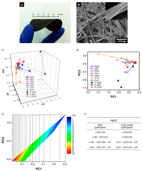 Photograph showing (a) the flexibility of a large-area, freestanding PPy/cellulose paper; (b) SEM images of a PPy/cellulose paper (inset: high-magnification image, the scale bar is 200 nm); (c,d) Principal component analysis plots of the responses of PPy/cellulose papers with data from real samples; (e,f) Calculation of Hg(II) concentration in groundwater. Reprinted with permission from [187]. Copyright 2014, Royal Society of Chemistry.