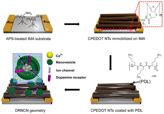 Remarkably, the field-effect transistor (FET) configuration has been used to achieve enhanced sensitivity. Receptor-modified CP nanomaterials are deposited as a channel bridging the source and drain electrodes. When the receptor recognizes a target species, the gate potential being applied on the channel changes, which in turn modulates the source-drain current. With this operating mechanism, many different types of FET sensors have been developed to detect glucose [189], odorants [190], proteins [191,192], and hormones [193]. Recently, a high-performance dopamine FET sensor was successfully demonstrated using human dopamine receptor-containing nanovesicles as the gate-potential modulator on a PEDOT nanotube channel (Figure 12) [184]. The lowest detection level was as low as 10 pM, which was 10 times more sensitive than that of previously reported CP-based dopamine sensors.