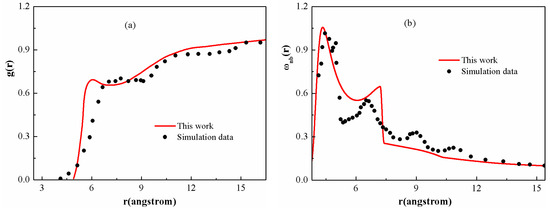 Figure 2 presents the inter- and intramolecular correlation functions for the PS chain given by the DFT, along with the simulation results that are attainable from the literature [42]. It is shown that the overall shape of theoretical curves and the positions of the main peaks can match the simulation results, indicating that the current theoretical model is suitable to quantitatively evaluate the microscopic structure of polymer melts. The deviations are probably due to the approximation of the model, in which the tacticity or torsional angle effects are overlooked. As shown in Figure 2a, on short length scales, the local structure of the PS chain is seen to have “liquid-like” tendency, displaying shells of first-nearest neighbors. Over longer distances, the curves exhibit a spatially slowly varying “correlation hole”, corresponding to the relative absence of neighboring sites due to intramolecular screening. Figure 2b presents the corresponding “nonbonded” intramolecular correlation functions. The discontinuity at Å is due to the direct interaction between next nearest neighbors along the polymer chain.