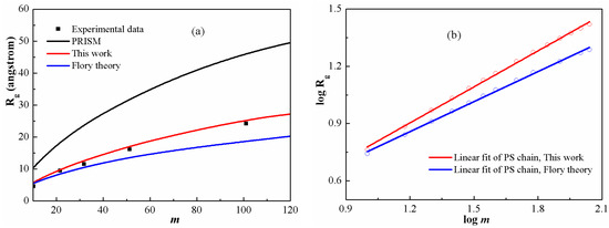 to quantitatively analyze polymer conformation. Figure 3a shows for PS chains at as function of chain length in comparison with the available experimental data [44]. It is clear that both the PRISM equation and the Flory theory cannot provide reasonable intramolecular structure description. In contrast, a good agreement has been achieved between DFT calculations and experimental values in the whole range of chain length. In particular, the scaling exponents derived from the Flory theory and the DFT are fitted in Figure 3b. The values are 0.50 and 0.63, respectively. It shows clearly that, at a low degree of polymerization, the exponent from DFT is obviously higher than the universal value (0.50). In other words, actual polymers at a low degree of polymerization display non-universal scaling behavior and have a relatively larger scaling exponent, which can be attributed to their rigid characteristics. Moreover, as the chain becomes stiffer, the excluded volume increases, leading to increasing . A similar result was also derived from molecular simulations [45,46].