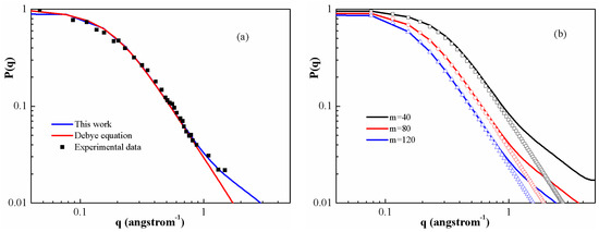 (a) Comparison between experimental data of the form factors and calculated ones for PS melt with the molecular weight 1 × 104 in θ solvent; (b) Form factor for different lengths of PS melt at 500 K. Solid lines correspond to DFT calculations in Equation (21). Symbols show the curve obtained from the Debye expression.