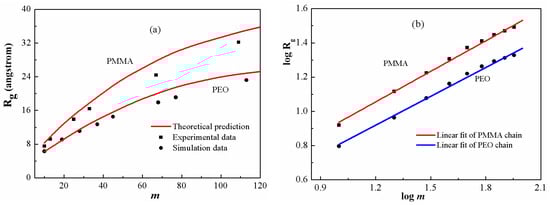 (a) Gyration radius as a function of chain length for PEO and PMMA melts at 300 K; (b) Determination of the scaling exponents for the two polymers. The squares and circles are calculated results and the solid line is the best linear regression.