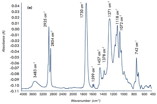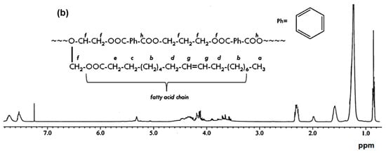 The infrared spectrum of the alkyd is shown in Figure 2a. The characteristic peaks are as follows: The broad band at 3483 cm−1 was due to O–H stretching, sharp peaks at 2930 and 2850 cm−1 were attributed to C–H stretching, and strong peak at 1730 cm−1 was due to C=O of carboxyl groups. The small peak at 1599 cm−1 was attributed to the aromatic ring, and C–H and C–R bending modes were observed at 1457 and 1377 cm−1, respectively. The small peaks at 1072, 1122 and 1272 cm−1 were due to C–O groups, and the weak peak at 743 cm−1 was attributed to aromatic =C–H bending. The 1H-NMR spectrum of alkyd and the assignments of various protons were shown in Figure 2b. Table 2 summarizes the properties of the alkyd and a plausible reaction of AlkPKO65 is shown in Figure 3.