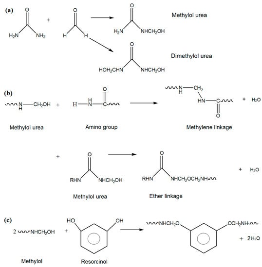 Figure 4a shows the reactions of urea with formaldehyde to form mono- and di-methylol urea. The methylol group could react with amino group to form methylene linkage, and with other methylol group to form ether linkage (Figure 4b). In addition, it could also react with –OH groups of resorcinol as in Figure 4c.