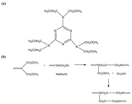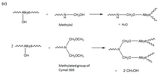 (a) Chemical structure of melamine resin (Cymel 303®); (b) Plausible reaction of melamine resin; and (c) Plausible reactions of alkyd with methylol urea and –N–CH2–O–CH3 of melamine resin.