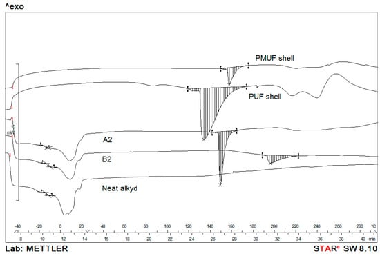 DSC thermograms of samples A2 and B2, the neat alkyd and shell materials.