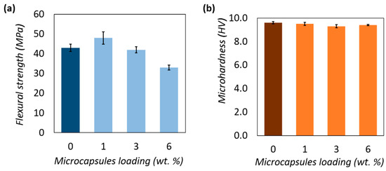 Effect of the microcapsules loading on the mechanical properties of the epoxy matrix: (a) Flexural strength; and (b) Microhardness (Vickers).