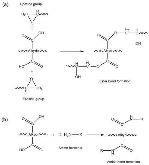 Scheme of plausible reactions of carboxylic groups of alkyd with: (a) Epoxy; and (b) Amino group.