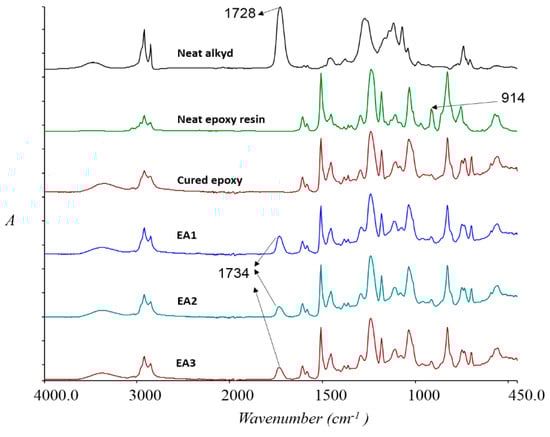 FTIR spectra of neat alkyd, epoxy resin and cured epoxy, EA1, EA2 and EA3 samples.
