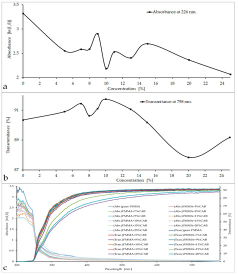 Initially, the CAB concentrations in PMMA were 5%, 10%, 15%, 20%, and 25%. The curve of absorbance vs. concentration for these five ascending concentrations showed that the lowest value of absorbency was at 10% CAB, i.e. about 2.184 (knowing that the absorption of pure PMMA is 3.321), with an increase in transparence up to 92%. The next step was to prepare new samples (7%, 8%, 9%, 11%, 13%, and 15%) to make a full survey of the low-absorbance area (10% CAB). Three samples were tested from each concentration and then measurements were taken to calculate the values of absorbance and transmittance. All absorbance and transmittance results were identical to those previously reported in Figure 1a,b. The absorbance curve at 226 nm showed a clear decrease with concentration, especially at 10% and 25% (Figure 1a). Conversely, fluctuations in the value of optical transmittance occurred in the visible region, as is evident in Figure 1b with two clear peaks at 7% CAB and 10% CAB. The sharp decline in transmittance curve happened at 25% CAB because the blend was heterogeneous at high concentrations [21]. The selection of PMMA/10%CAB as the best blend concentration meets the required purpose of the work, which is achieve the lowest absorbency of optical radiation within the UV region, especially at the damage threshold of PMMA (226 nm). Decreasing the absorbance value in the damage threshold area reduced the effect of trapped harmful rays inside the material and made the material more transparent to these rays, meeting the purpose of research [22,23]. Conversely, there was a slight increase in the value of transparency in the visible region, which should improve PMMA performance.