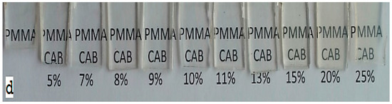In the PMMA/CAB blends, it was noted that the samples were transparent up to 20% CAB; after that, the samples started to become hazy with increasing CAB concentrations in PMMA. Samples with concentrations greater than 20% were discarded because they did not meet the required purpose (Figure 1d).
