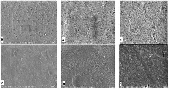 The SEM images taken for the internal morphological study of pure PMMA and PMMA/10%CAB blend are shown in (Figure 2). The SEM images for each sample are shown at three different scale bar (2, 5, 10 µm). As can be seen in the pure PMMA images, there were uniform morphological features, indicating a single material (Figure 2a–c) [24].