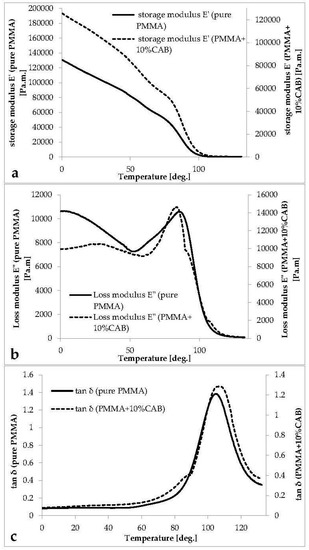 The curves of the storage modulus E' (the ability of the material to store potential energy), loss modulus E" (energy dissipation in the form of heat upon deformation), and phase angle tan δ (the mechanical damping or internal friction in a viscoelastic system) vs. temperature for pure PMMA, and PMMA/10%CAB blends are shown in (Figure 4).