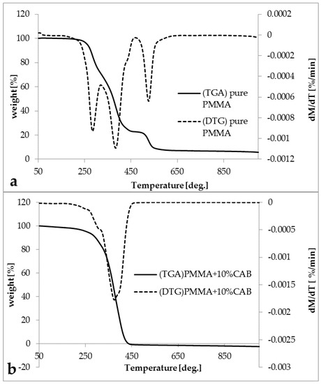 Multi-stage processes, such as those observed in pure PMMA, may cause differences in apparent activation energy values over the transformation range; however, unequivocal interpretation of such changes is not easy. Thus, 10%CAB inhibits activation energy values of the blend [42]. The break in each thermogram indicates the onset of the decomposition process involving a rapid loss in weight [43].