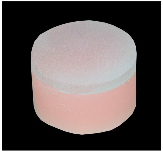 For the experiments, a total of 140 cylindrical specimens were made from PMMA (Palapress, Heraeus-Kulzer, Hanau, Germany). The specimens were prepared according to the manufacturer’s instructions, i.e., the powder-to-liquid ratio was 10 g to 7 mL, mixed for 15 s at room temperature (approx. 23 °C), poured into the casting mold within a period of two minutes, polymerized for 20 min at 55 °C and a pressure of 2.5 bar and smoothed with 1000 grit sandpaper. There were 70 PMMA specimens of 13.0 mm diameter and 6.0 mm height; a further 70 specimens were 13.0 mm in diameter and 5.0 mm in height. For the latter ones, 70 PET disks of 13.0 mm in diameter and 1.0 mm in height (Erkodur, ERKODENT Erich Kopp GmbH, Pfalzgrafenweiler, Germany) were prepared and glued to the PMMA cylinder’s front surfaces using quick-setting cyanoacrylate glue (Sekundenkleber, Renfert GmbH, Hilzingen, Germany). The specimens were divided into 14 groups with 10 specimens each: 7 groups to investigate the abrasion resistance between PMMA and CS, and 7 groups to investigate the abrasion resistance between PET and CS (Figure 1).