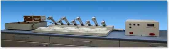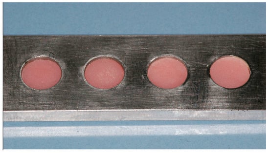 After CS coating all specimens underwent abrasion tests using a Willytec tooth-brushing simulator (Willytec GmbH, Munich, Germany) with soft brushes in an artificial saliva (Table 2) (load 2N, 2 cycles/s, 32 °C, Figure 4). To simulate short-term use, 3000 cycles of abrasion were performed on all CS-coated specimen surfaces. To simulate long-term use, all remaining CS coatings were removed, the specimen surfaces smoothed again with 1000 grit sandpaper, the CS coatings renewed, and all specimen surfaces exposed to 30,000 cycles of abrasion.