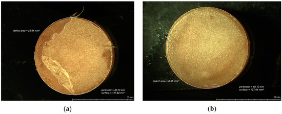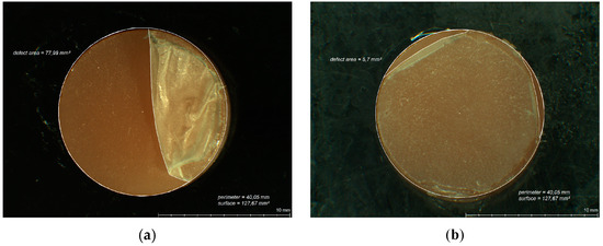 After each abrasion test, the specimen surfaces were analyzed for areas of lost CS coating (Figure 5a,b and Figure 6a,b) by means of digital planimetry under a light microscope (Leica MZ12, Meyer Instruments, Houston, TX, USA) and the percentage of remaining intact CS coating calculated.