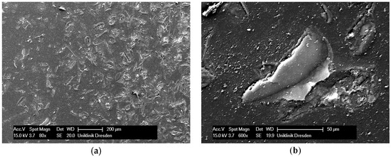SEM picture of PET surface sandblasted at 2.8 bar Rocatec Pre and Rocatec Plus ((a) magnification 80×; (b): single impacted particle, magnification 600×).