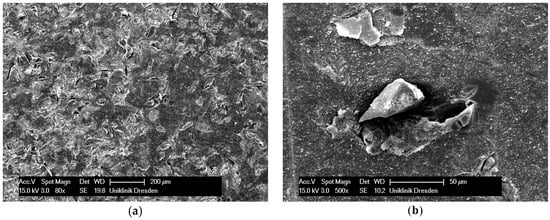 The step of ultrasonic cleaning was conducted with the intention to remove loose particles from the resin surfaces after sandblasting with Rocatec Plus. With 4% CS acetate solution and 4.0 bar blast pressure, the medians of the remaining CS were 92.9% with ultrasonic cleaning and 81.6% and without ultrasonic cleaning (test series V versus VII). However, the differences were not significant. When sandblasting was done at 2.8 bar, the abrasion resistance dropped significantly when ultrasonic cleaning was carried out (test series IV versus VI). A reason might be a tighter bond of the impacted Rocatec Plus particles or their fragments to the resin material (Figure 7a,b and Figure 8a,b) when sandblasting was conducted at 4.0 bar, whereas at 2.8 bar, the looser impacted particles detach unintentionally during ultrasonic cleaning. Thus, with regard of a simple and cost-effective workflow, it seems to be justifiable to omit the step of ultrasonic cleaning. Null hypothesis 4 (independence of abrasion resistance from ultrasonic cleaning) also had to be rejected.
